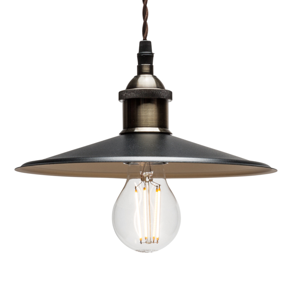 Lámpara colgante de techo de estilo retro, años 40. Portalámparas y florón en acabado bronce. Cable trenzado con recubrimiento textil de color marrón ajustable en altura. Plato plano de reducidas dimensiones “plato chino”, de metal negro textura y dorado mate en su interior.