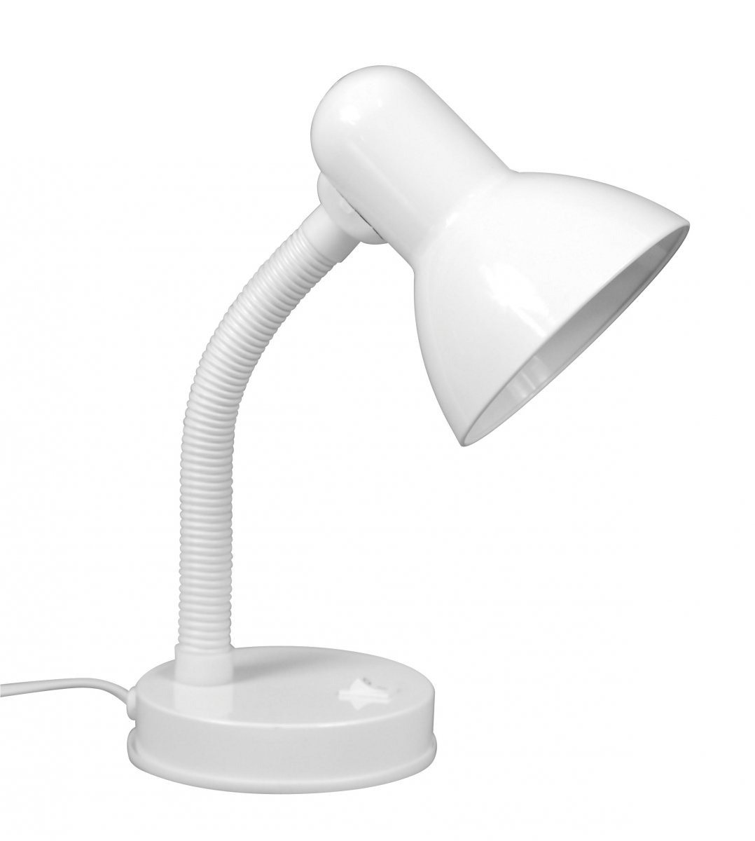 Lámpara flexo de sobremesa muy práctica y económica. Fabricada en metal de color blanco. Con brazo flexible y cabeza orientable. Ideal para estudio. Incorpora interruptor en la base. Cable de conexión de 1,5 m. Para bombillas de rosca estándar E-27.