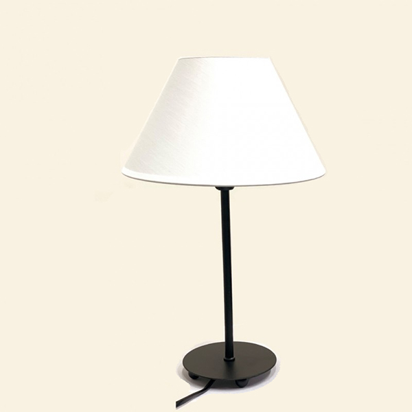 Lámpara de sobremesa formada por un pie de metal color negro y una pantalla textil blanca. Lámpara de estilo rústica, de línea sobria. Ideal para dormitorios, salones, recibidores, salas de espera, etc.