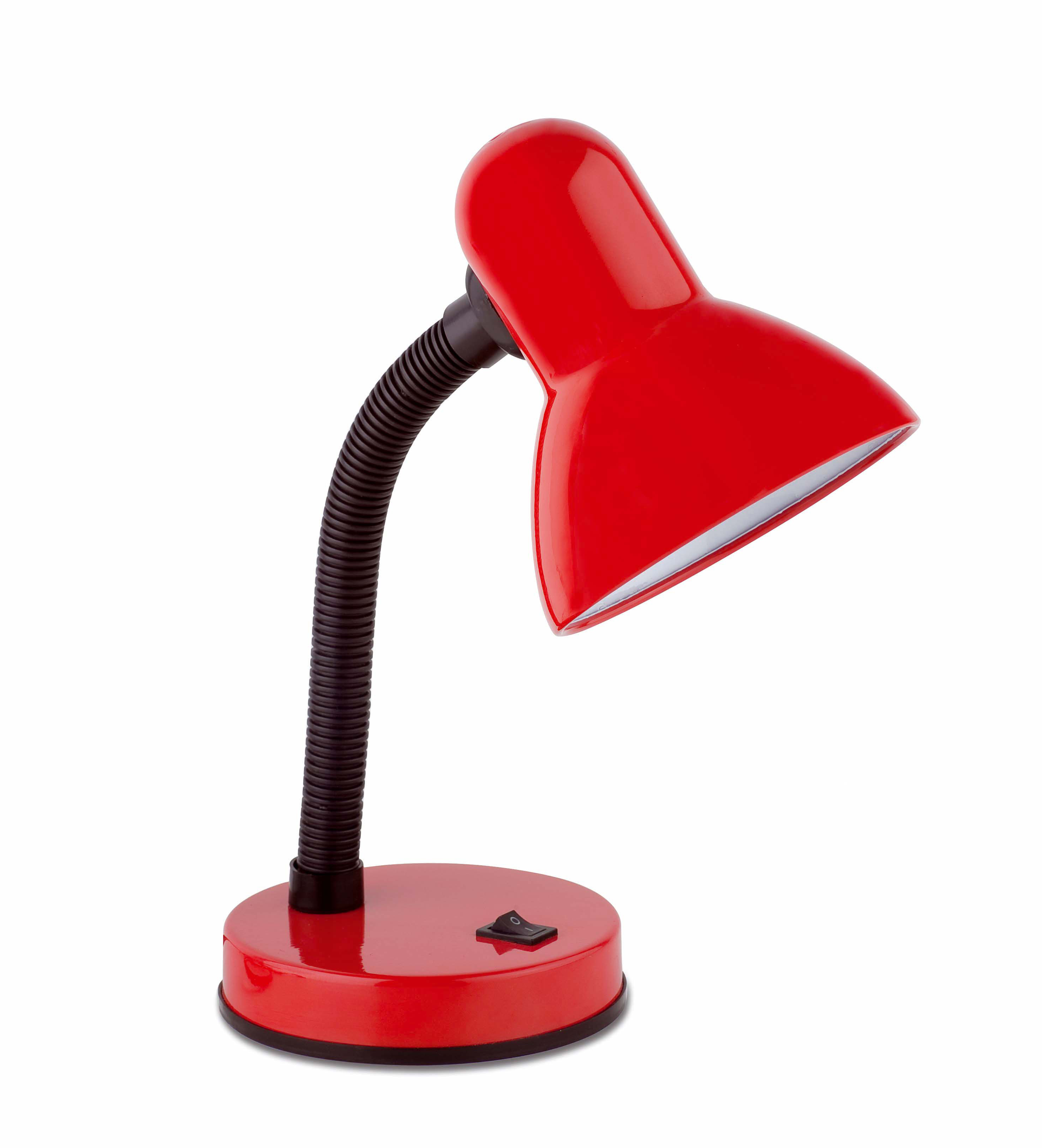 Lámpara flexo de sobremesa muy práctica y económica. Fabricada en metal de color rojo. Con brazo flexible y cabeza orientable. Ideal para estudio. Incorpora interruptor en la base. Cable de conexión de 1,5 m. Para bombillas de rosca estándar E-27.