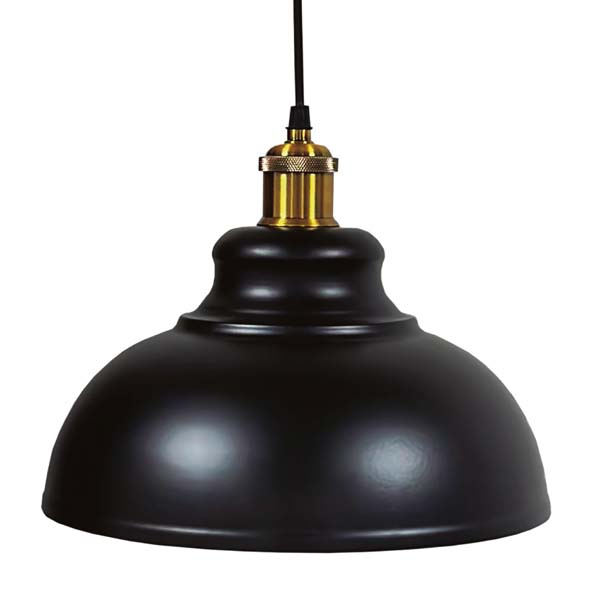Lámpara de techo con campana de metal negra de 29cm de diámetro. Portalámparas decorativo color dorado.