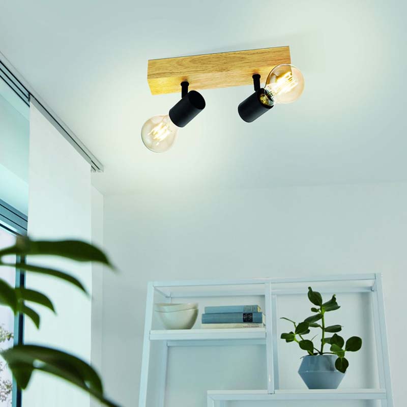 Esta lámpara de techo se compone de un cuerpo de madera con dos cabezales móviles de metal negro y completa las tendencias de decoración de estilo vintage e industrial. Lámpara de techo moderna que mezcla la madera de pino y metal, ideal para cualquier estancia gracias a sus cabezales giratorios, ya sea en la cocina, el salón, el dormitorio, el pasillo o el comedor. La lámpara es apta para cualquier bombilla con casquillo E27.