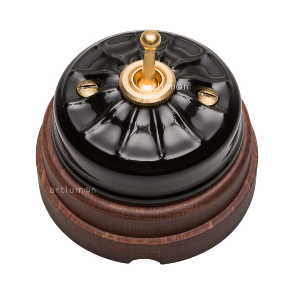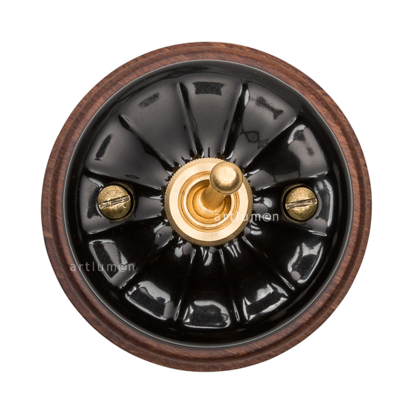 Interruptor con mecanismo conmutado de palanca, conocidos popularmente como “de rabillo”. Porcelana de alta calidad grabada con relieves vintage. La porcelana de color negro aporta una innovadora combinación de retro y vanguardismo.