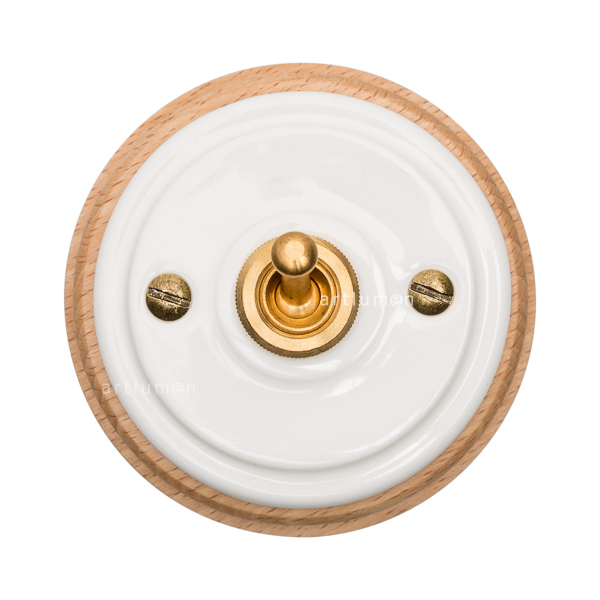 Interruptor con mecanismo conmutado de palanca, conocidos popularmente como “de rabillo”. El mecanismo queda elegantemente integrado en la porcelana, rematado con una arandela embellecedora metálica. Montado sobre una base de madera de haya barnizada en acabado natural. Combina a la perfección con nuestros enchufes de porcelana de esta misma serie.