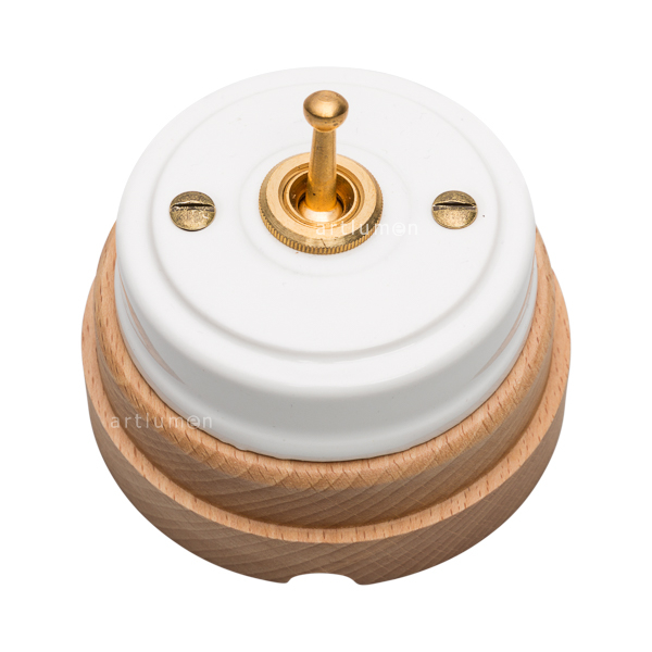Interruptor con mecanismo conmutado de palanca, conocidos popularmente como “de rabillo”. El mecanismo queda elegantemente integrado en la porcelana, rematado con una arandela embellecedora metálica. Montado sobre una base de madera de haya barnizada en acabado natural. Combina a la perfección con nuestros enchufes de porcelana de esta misma serie.