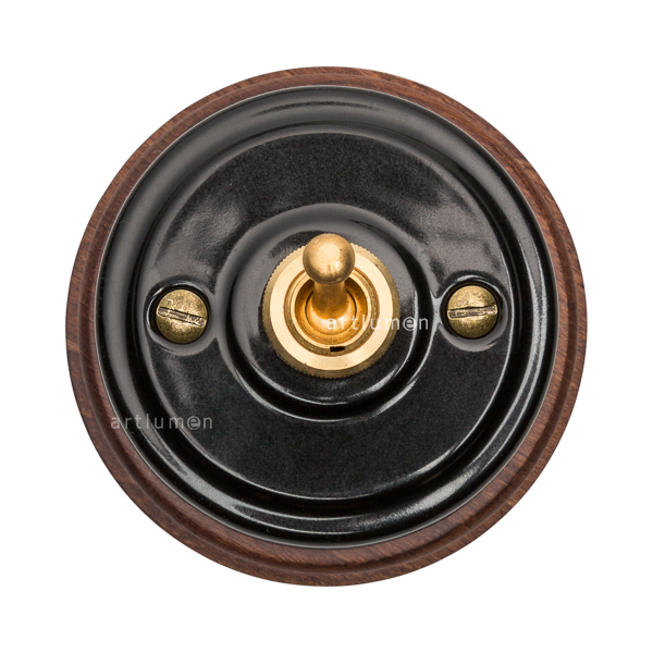 Interruptor con mecanismo conmutado de palanca, conocidos popularmente como “de rabillo”. La porcelana de color negro aporta una innovadora combinación de retro y vanguardismo.