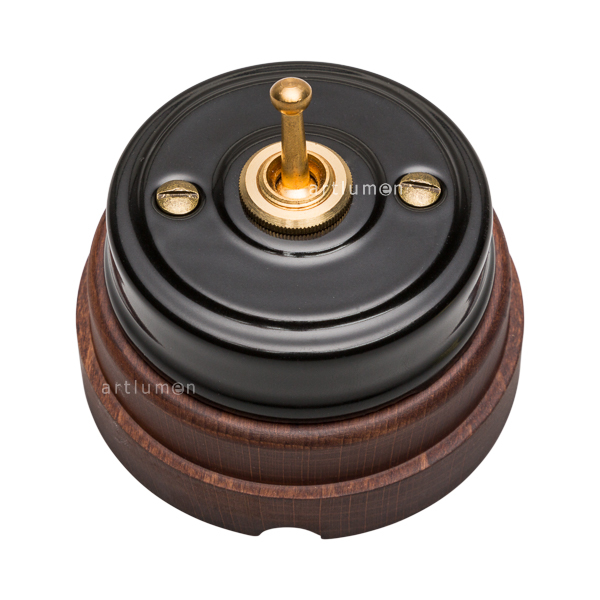 Interruptor con mecanismo conmutado de palanca, conocidos popularmente como “de rabillo”. La porcelana de color negro aporta una innovadora combinación de retro y vanguardismo.