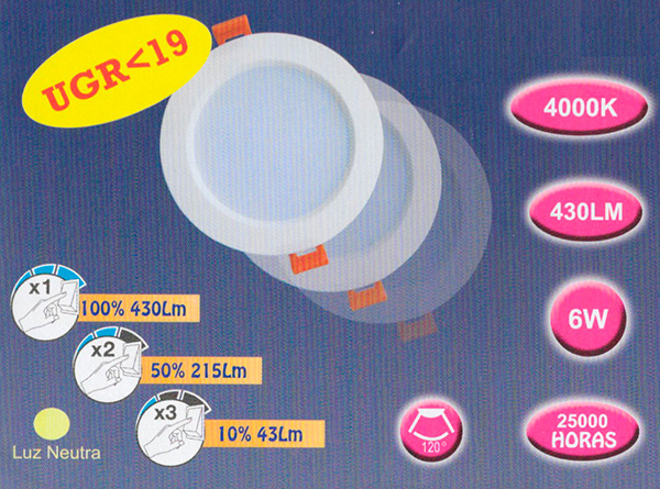Downlight LED para empotrar con 3 intensidades de luz. Desde un interruptor normal, la primera vez que se enciende, se ilumina al 100% (430 Lumens), si apagamos y volvemos a encender, se ilumina al 50% (215 Lumnes), si lo volvemos a repetir, queda iluminado de forma muy suave, a un 10% (43 Lumens).