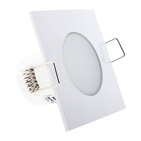 Luminaria LED para empotrar. Aro cuadrado de color blanco estanco IP54, se puede utilizar en baños encima de bañeras y duchas o en zonas donde se pueda mojar de forma indirecta. Incorpora una luz LED de 5W de color blanco frío (6500ºk), ofreciendo una luminosidad de 350 Lumens.