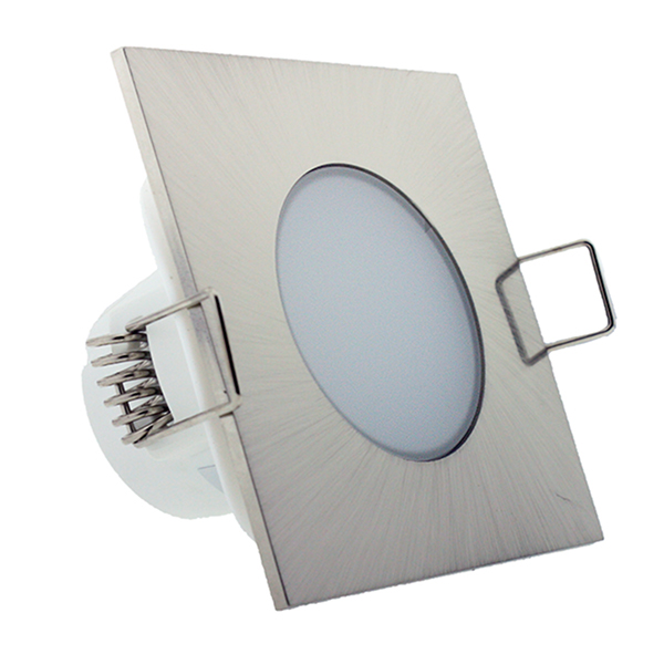 Aro cuadrado en acabado níquel mate para empotrar con luz LED de 5W de color blanco frío (6500ºk), ofreciendo una luminosidad de 350 Lumens. Para empotrar, estanco IP54, se puede utilizar en baños, sobre bañeras y duchas o en zonas donde se pueda mojar de forma indirecta.