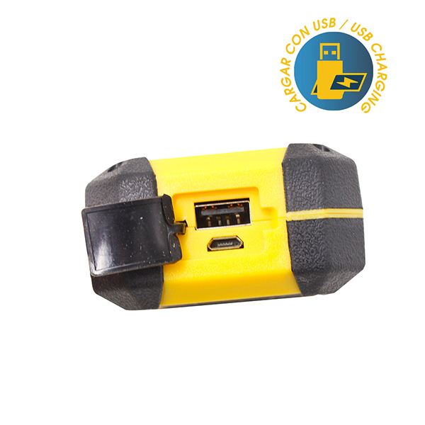 Linterna de alta luminosidad, con un potente LED COB de 8W, ofreciendo 500 lumens, con 20m de alcance. Recargable con cable USB (no incluido). 5 horas de carga ofrecen 6 horas de autonomía.
