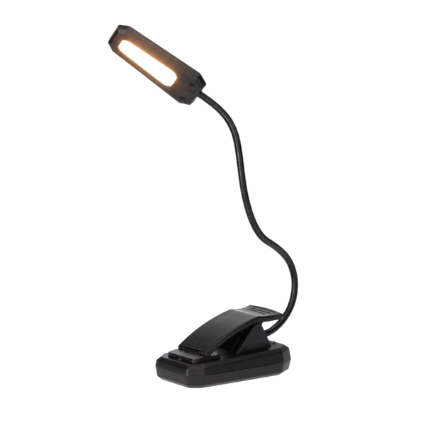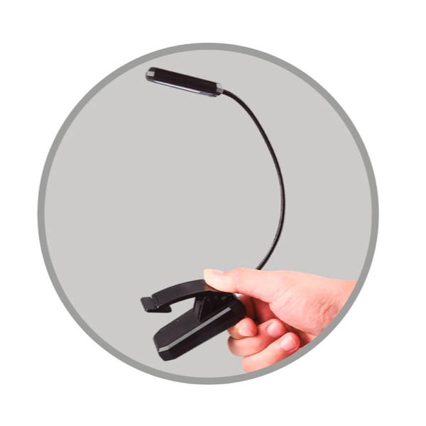 Linterna LED de lectura con pinza para sujeción. Recargable por USB con una autonomía de unas 10 horas. Lámpara linterna de reducido tamaño y muy ligera. Interruptor con tres posiciones, para tres intensidades de alumbrado: 15Lm, 30Lm y 60Lm. Su brazo es un flexo que permite girar la lámpara en cualquier ángulo y darle una forma.