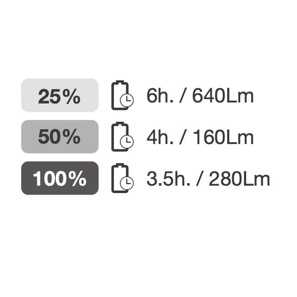 Autonomía de la batería: Al 25% (64Lm) 6 horas, al 50% (160Lm) 4 horas, al 100% (280Lm) 3,5 horas.