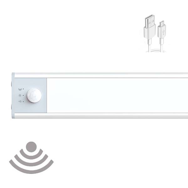 Regleta LED de alto brillo con detección de movimiento. Se puede seleccionar el color del LED (luz blanca, neutra o cálida). Incorpora un sensor crepuscular y de movimiento. Se enciende instantáneamente al detectar una persona, se apaga automáticamente.