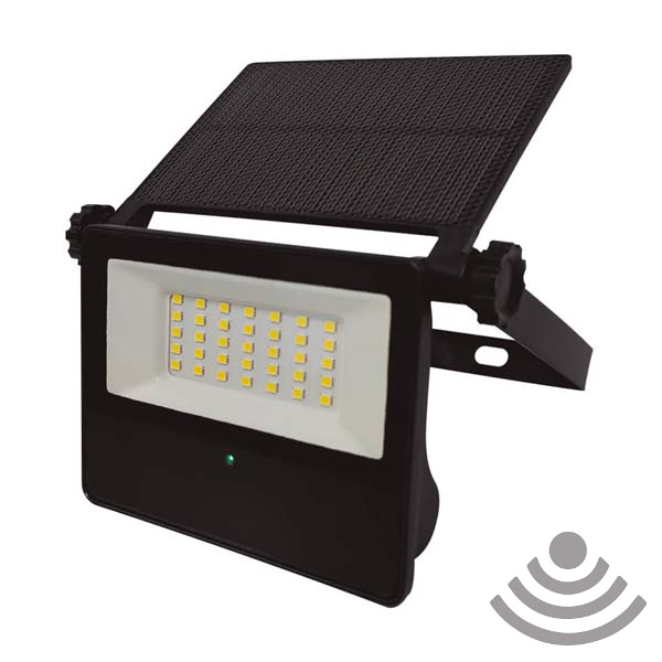 Proyector de pared con luz LED que se carga con su propio panel solar. Dispone de un sensor de movimiento para encender la luz cuando esta oscuro y detecta presencia. Se apaga automáticamente después de 30 segundos de abandonar el área de detección. De reducidas dimensiones y muy ligero. Protegido para uso exterior. Foco orientable 360º, placa solar orientable 135º