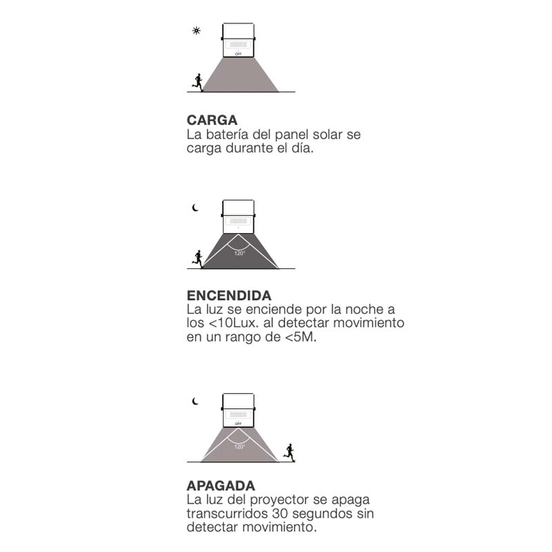 Proyector de pared con luz LED que se carga con su propio panel solar. Dispone de un sensor de movimiento para encender la luz cuando esta oscuro y detecta presencia. Se apaga automáticamente después de 30 segundos de abandonar el área de detección. De reducidas dimensiones y muy ligero. Protegido para uso exterior. Foco orientable 360º, placa solar orientable 135º