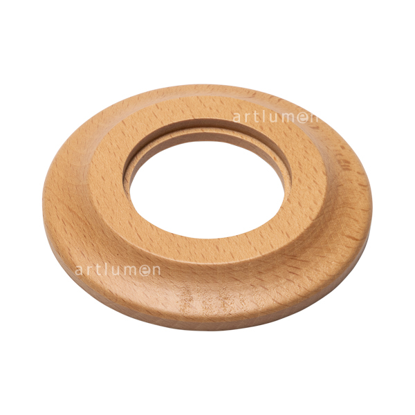 Marco de madera para instalación de un elemento de esta serie empotrada en cajetín (valido para caja redonda o cuadrada). Bonita madera de Haya, con suaves formas redondeadas, torneada a mano y barnizada en acabado natural.