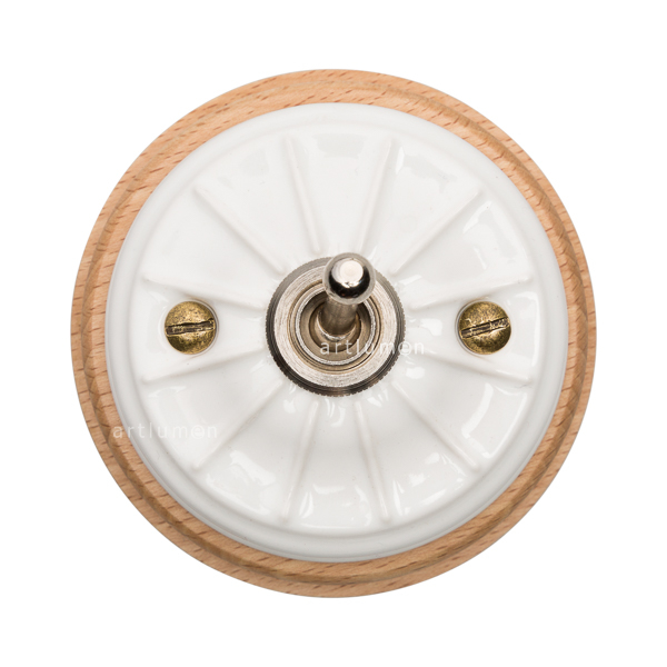 Interruptor con mecanismo conmutado de palanca, conocidos popularmente como “de rabillo”. Porcelana de alta calidad grabada con relieves vintage. El mecanismo queda elegantemente integrado en la porcelana, rematado con una arandela embellecedora metálica. Montado sobre una base de madera de haya barnizada en acabado natural. Combina a la perfección con nuestros enchufes de porcelana de esta misma serie.
