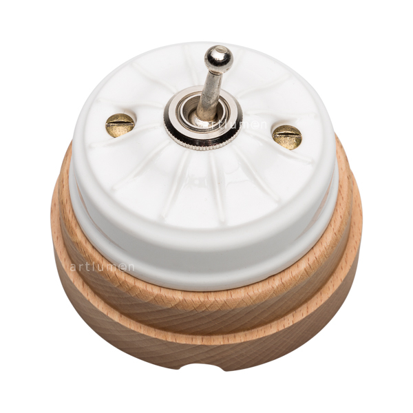 Interruptor con mecanismo conmutado de palanca, conocidos popularmente como “de rabillo”. Porcelana de alta calidad grabada con relieves vintage. El mecanismo queda elegantemente integrado en la porcelana, rematado con una arandela embellecedora metálica. Montado sobre una base de madera de haya barnizada en acabado natural. Combina a la perfección con nuestros enchufes de porcelana de esta misma serie.
