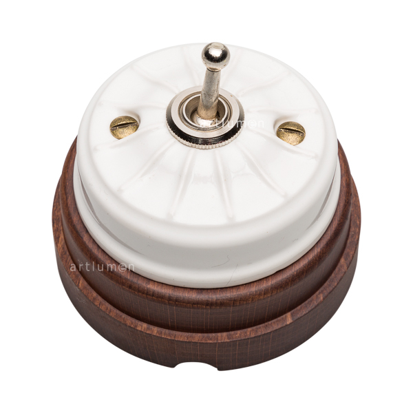 Interruptor con mecanismo conmutado de palanca, conocidos popularmente como “de rabillo”. Porcelana de alta calidad grabada con relieves vintage. El mecanismo queda elegantemente integrado en la porcelana, rematado con una arandela embellecedora metálica. Montado sobre una base de madera de haya barnizada en color castaño oscuro. Marco de madera torneado a mano.