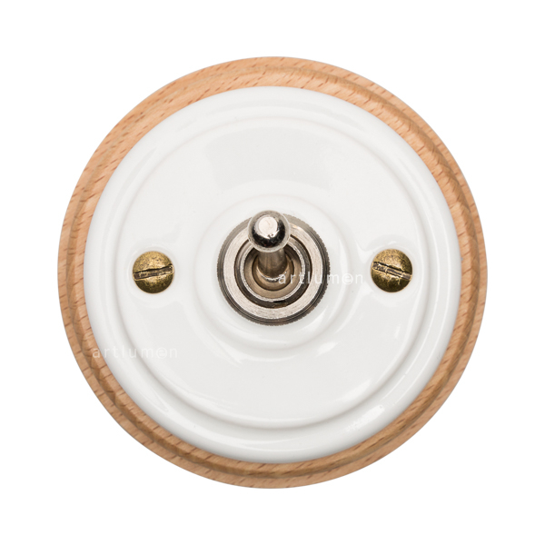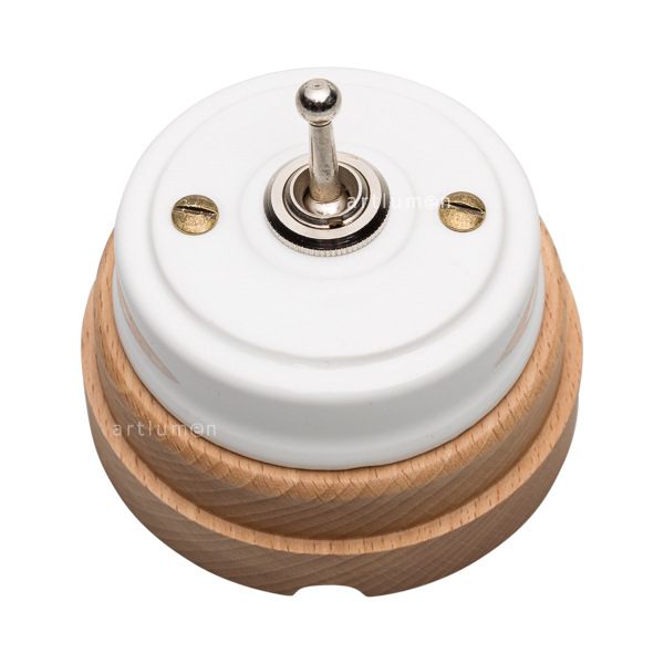 Interruptor con mecanismo conmutado de palanca, conocidos popularmente como “de rabillo”. El mecanismo queda elegantemente integrado en la porcelana, rematado con una arandela embellecedora metálica. Montado sobre una base de madera de haya barnizada en acabado natural. Combina a la perfección con nuestros enchufes de porcelana de esta misma serie.