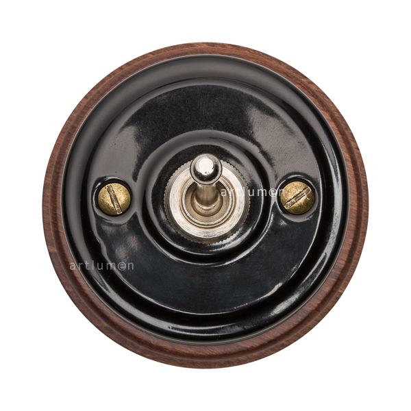 Interruptor con mecanismo conmutado de palanca, conocidos popularmente como “de rabillo”. La porcelana de color negro aporta una innovadora combinación de retro y vanguardismo.