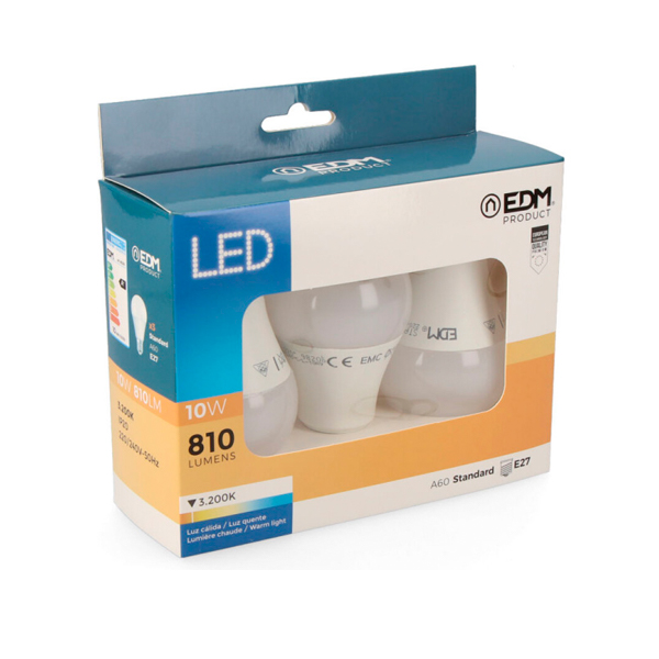 Pack de 3 bombillas LED estándar. Consumo de solo 10W, equivale a una bombilla tradicional de unos 90W (923 Lumens).