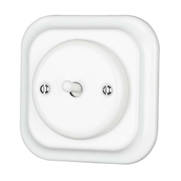 Interruptor conmutado de palanca fabricado en porcelana con marco (embellecedor) también de porcelana blanca.