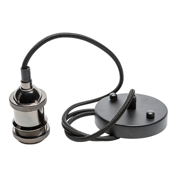 Colgante con espectacular portalámparas de metal de color negro grafito. Florón de techo de metal en color negro mate. Cable redondo con recubrimiento textil negro. Ideal para bombillas decorativas. También permite usar pantallas, tulipas, jaulas, etc. Para bombillas de rosca estándar E-27.