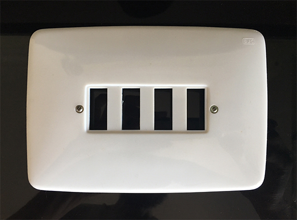 Placa de 4 elementos para mecanismos de la antigua serie “Estrella” del fabricante BJC. Formato grande (se denominaba “placa TV”).