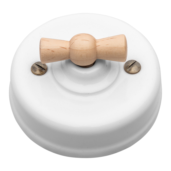 Interruptor de porcelana con el lazo de madera de haya. Hacen que cada gesto para encender la luz sea un pequeño placer.