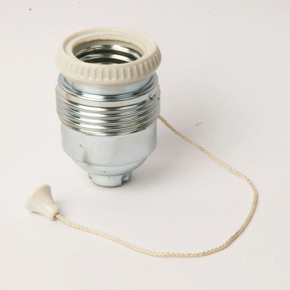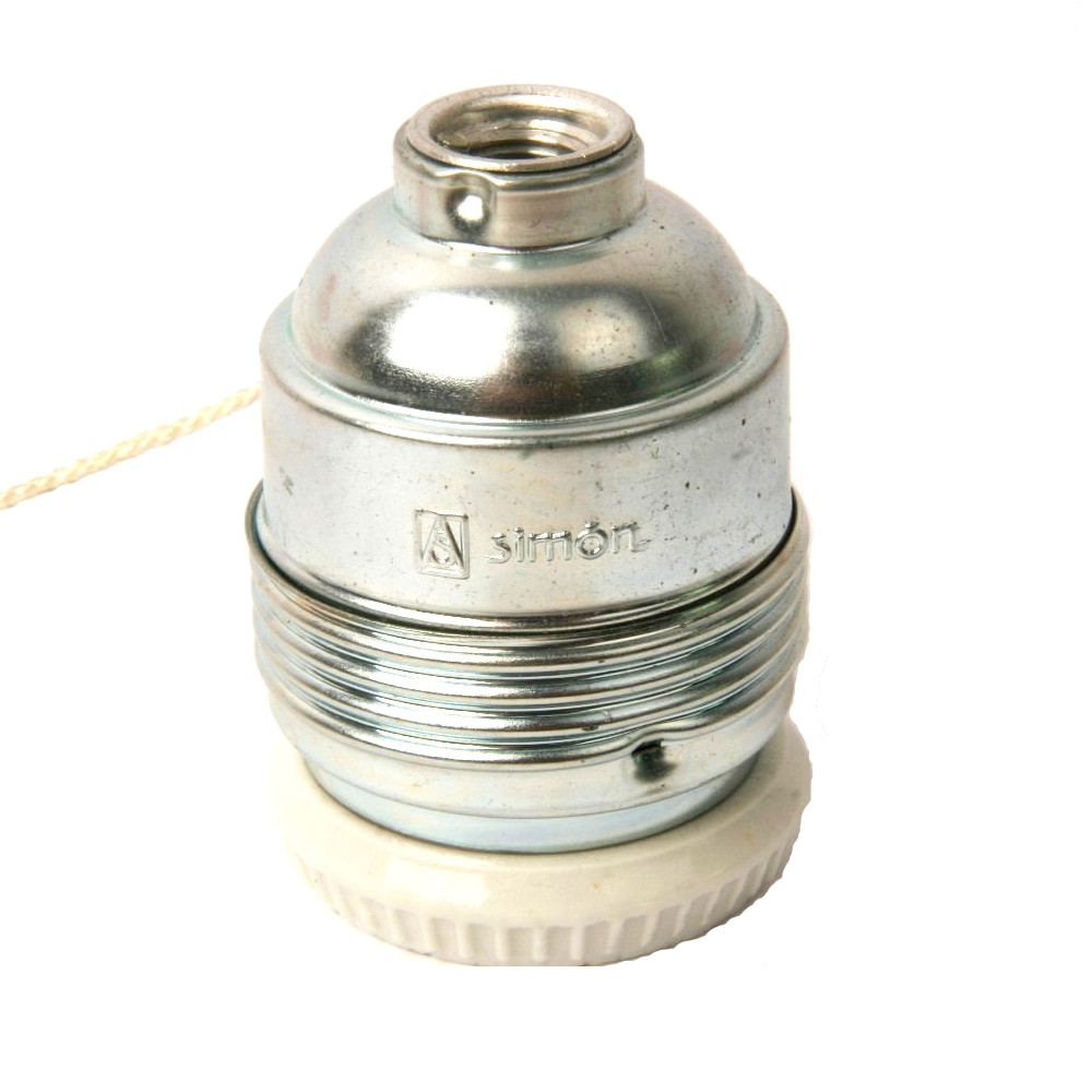 Pieza original de los años 70 del fabricante Simon (no es una replica). ideal para coleccionistas o para restaurar lámparas antiguas. Portalámparas metálico plateado con arandela de porcelana esmaltada. Incorpora un interruptor lateral que se acciona con tirador. Permite montar una lámpara y que se encienda por el mismo portalámparas (sin ningún cable adicional).