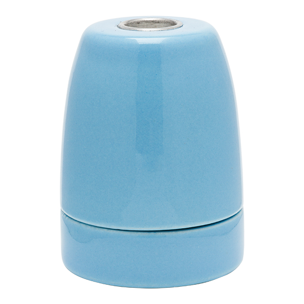 Portalámparas de porcelana azul. Cuerpo liso en porcelana esmaltada de color azul. Estilo vintage. Casquillo para bombillas de rosca estándar E-27. Parte superior con paso de rosca 10/100. Embornamiento del cable por tornillos.