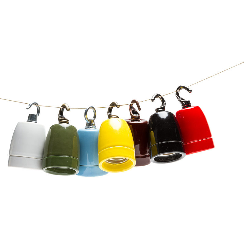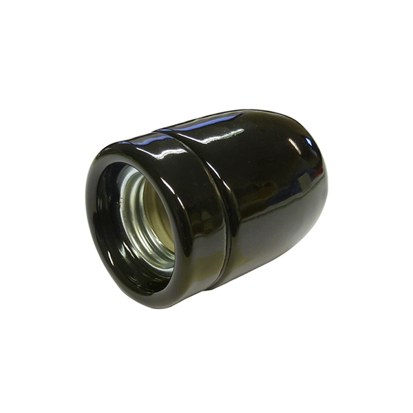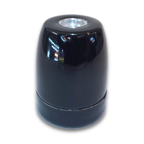 Portalámparas de porcelana negro. Cuerpo liso en porcelana esmaltada de color negro. Estilo vintage. Casquillo para bombillas de rosca estándar E-27. Parte superior con paso de rosca 10/100. Embornamiento del cable por tornillos.