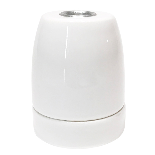 Portalámparas de porcelana blanco. Cuerpo liso en porcelana esmaltada de color blanco. Estilo vintage. Casquillo para bombillas de rosca estándar E-27. Parte superior con paso de rosca 10/100. Embornamiento del cable por tornillos.