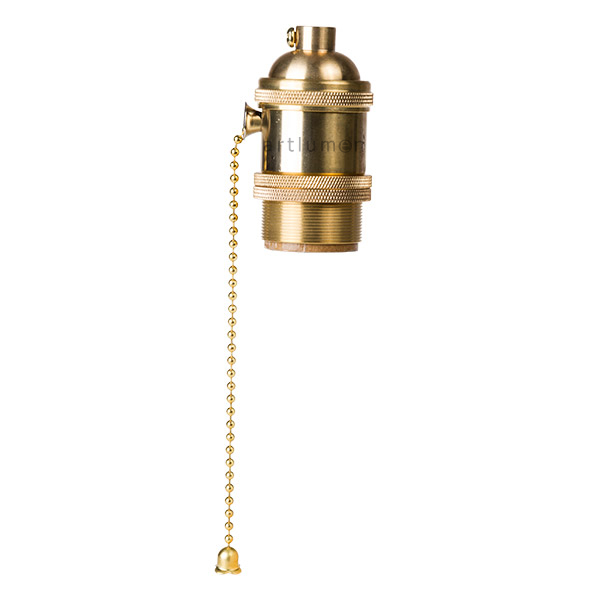 Portalámparas metálico acabado latón. Medio cuerpo liso y final roscado con arandelas metálicas para sujeción de pantallas. Incorpora un interruptor lateral que se acciona con tirador de cadena metálica. Permite montar una lámpara y que se encienda por el mismo portalámparas (sin ningún cable adicional). Para bombillas de rosca estándar (E-27). Parte superior con paso de rosca 10/100 y tornillo prisionero. Embornamiento del cable por tornillo.