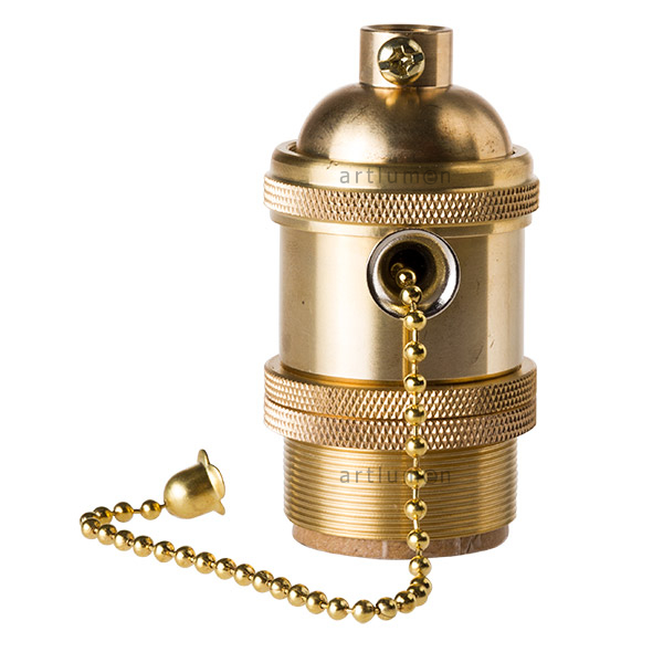 Portalámparas metálico acabado latón. Medio cuerpo liso y final roscado con arandelas metálicas para sujeción de pantallas. Incorpora un interruptor lateral que se acciona con tirador de cadena metálica. Permite montar una lámpara y que se encienda por el mismo portalámparas (sin ningún cable adicional). Para bombillas de rosca estándar (E-27). Parte superior con paso de rosca 10/100 y tornillo prisionero. Embornamiento del cable por tornillo.