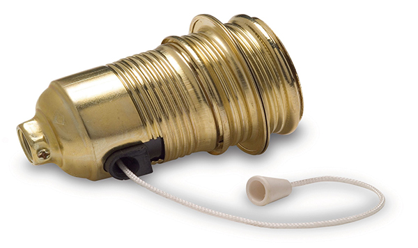 Portalámparas metálico dorado con cuerpo roscado y dos arandelas metálicas para sujeción de pantallas. Incorpora un interruptor lateral que se acciona con tirador. Permite montar una lámpara y que se encienda por el mismo portalámparas (sin ningún cable adicional). Para bombillas de rosca estándar (E-27). Parte superior con paso de rosca 10/100. Embornamiento del cable por tornillo.