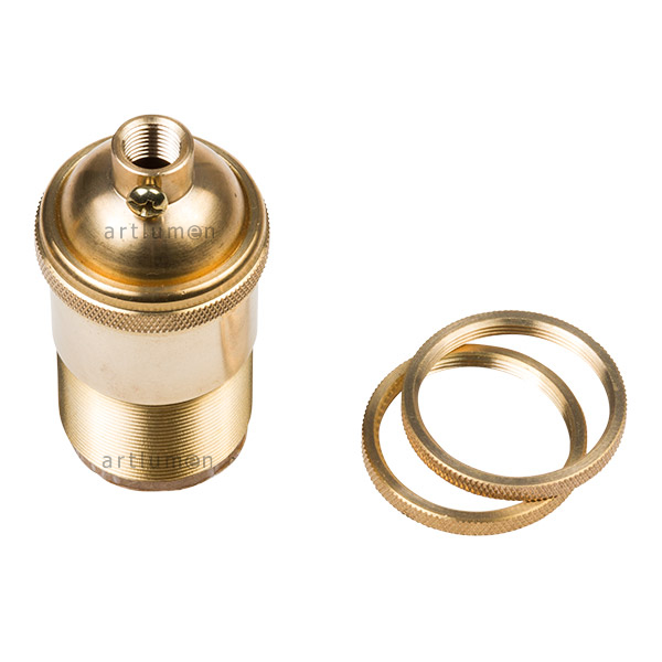 Portalámparas metálico acabado latón. Medio cuerpo liso y final roscado con arandelas metálicas para sujeción de pantallas. Para bombillas de rosca estándar (E-27). Parte superior con paso de rosca 10/100 y tornillo prisionero. Embornamiento del cable por tornillo.