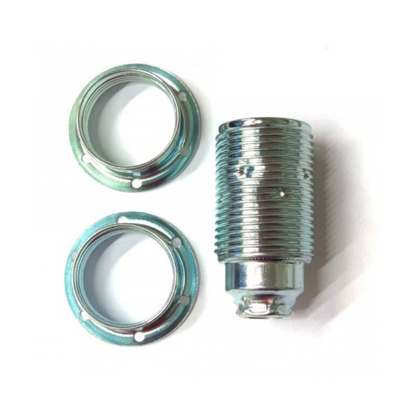 Se trata de un portalámparas metálico con cuerpo roscado, que viene con dos arandelas para sujeción de pantallas o tulipas. Niquelado (color plata). En la parte superior tiene un paso de rosca 10/100. Con embornamiento del cable por tornillo. Portalámparas para bombillas de rosca fina (E-14)