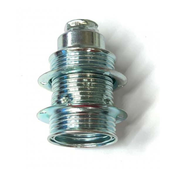 Se trata de un portalámparas metálico con cuerpo roscado, que viene con dos arandelas para sujeción de pantallas o tulipas. Niquelado (color plata). En la parte superior tiene un paso de rosca 10/100. Con embornamiento del cable por tornillo. Portalámparas para bombillas de rosca fina (E-14)