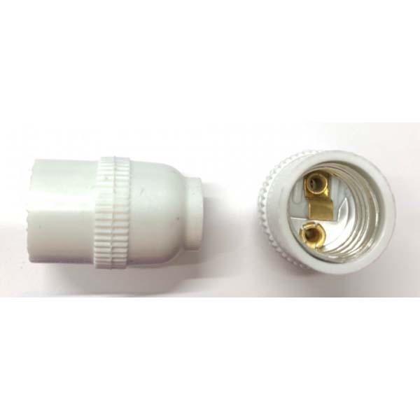 Casquillo portalámparas de plástico para bombillas de rosca fina (E-14). De muy reducido tamaño.