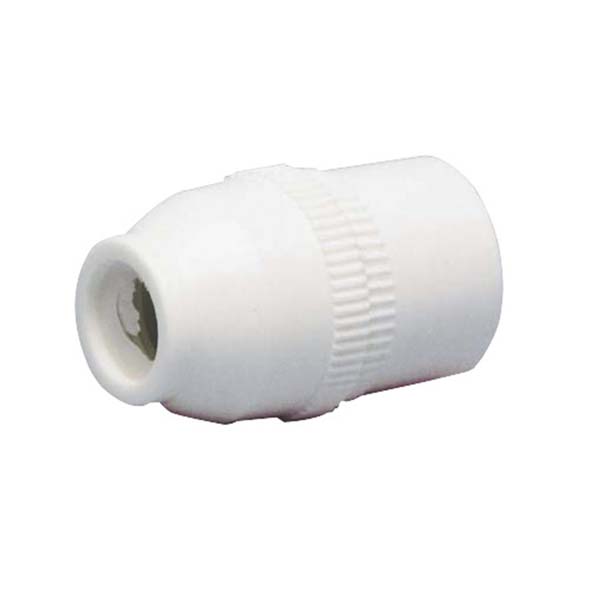 Casquillo portalámparas de plástico para bombillas de rosca fina (E-14). De muy reducido tamaño.