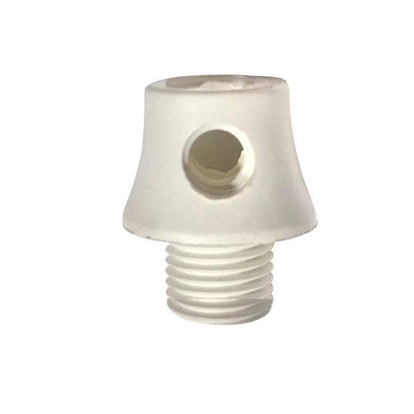 Sujeta cables de plástico de color blanco con paso de rosca macho. La parte por donde entra el cable, es de forma cónica y dispone de un tornillo lateral. Elemento que tiene la función de fijar el cable del portalámparas para evitar que el tornillo soporte el peso o rotura en caso de tirón. Imprescindible en los colgantes de lámparas. Rosca macho paso 10/100 (el mismo que tienen todos nuestros portalámparas)