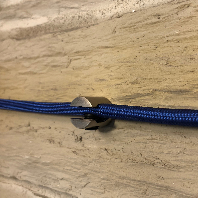 Pieza metálica en acabado acero para fijar el cable a la pared o techo. Dispone de un orificio en su base para ser atornillado. Mediante su tornillo lateral regulamos la presión del prensacables. El tornillo lleva un aislador plástico en su interior para no dañar el cable.