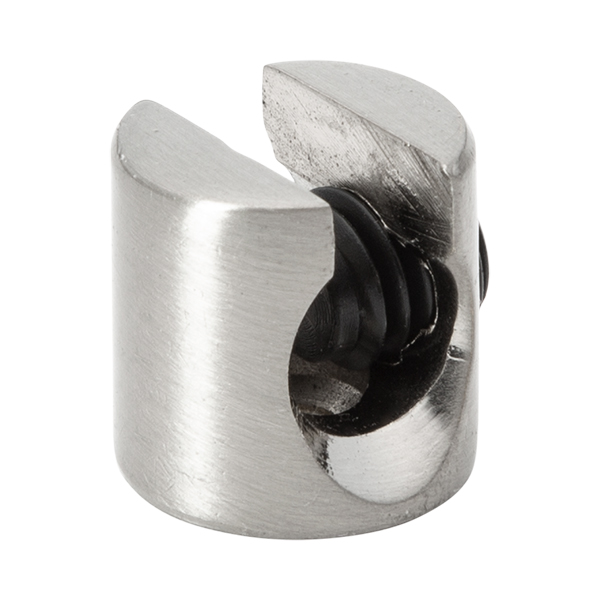 Pieza metálica en acabado acero para fijar el cable a la pared o techo. Dispone de un orificio en su base para ser atornillado. Mediante su tornillo lateral regulamos la presión del prensacables. El tornillo lleva un aislador plástico en su interior para no dañar el cable.