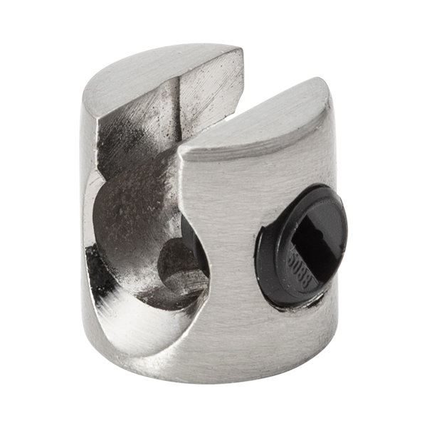 Pieza metálica en acabado acero para fijar el cable a la pared o techo. Dispone de un orificio en su base para ser atornillado. Mediante su tornillo lateral regulamos la presión del prensacables. El tornillo lleva un aislador plástico en su interior para no dañar el cable.