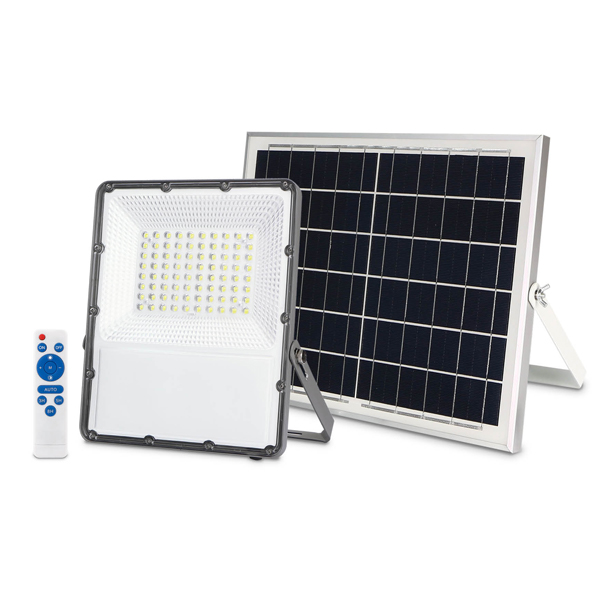 Kit compuesto por un proyector LED, de 30W de potencia, con luz blanca y un panel solar para cargar el foco, mediante cable incluido. Una vez cargado, el foco funciona también sin conexión a la placa (como un portátil). Mando a distancia para encender/apagar, regular la intensidad de luz y programar desconexión automática.