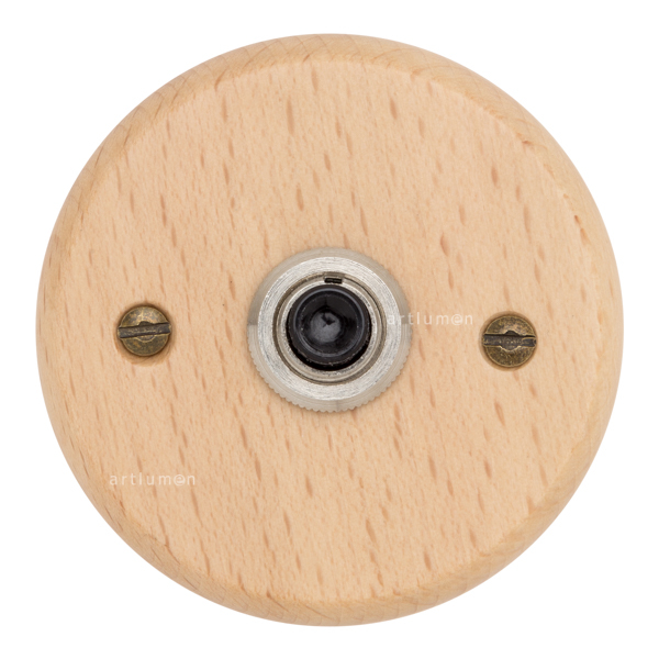 Pulsador de timbre con botón de color negro. Fabricado en madera de haya barnizada en acabado natural.