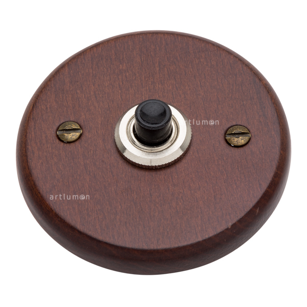 Pulsador de timbre con botón de color negro. Fabricado en madera de haya barnizada en color castaño oscuro.